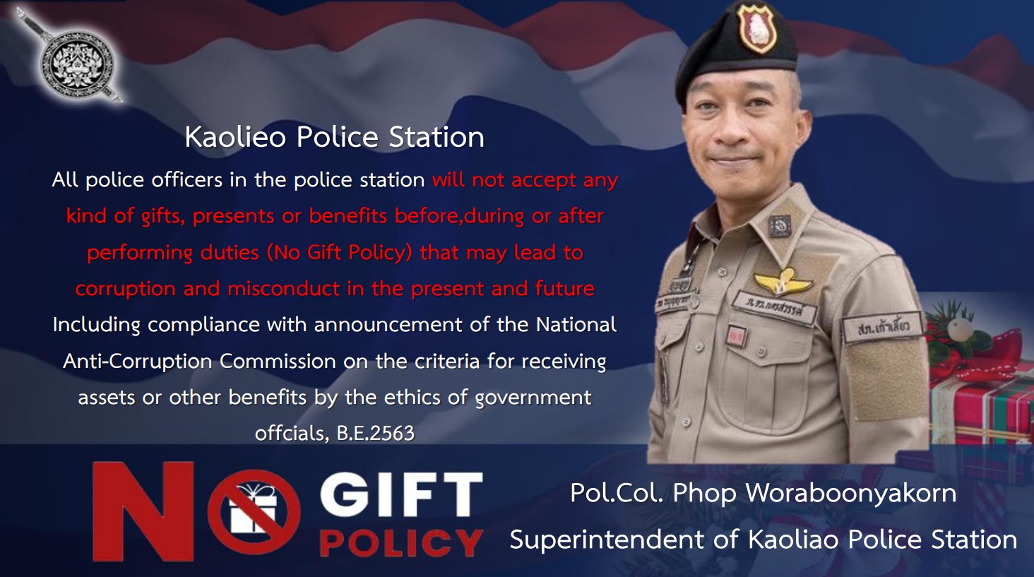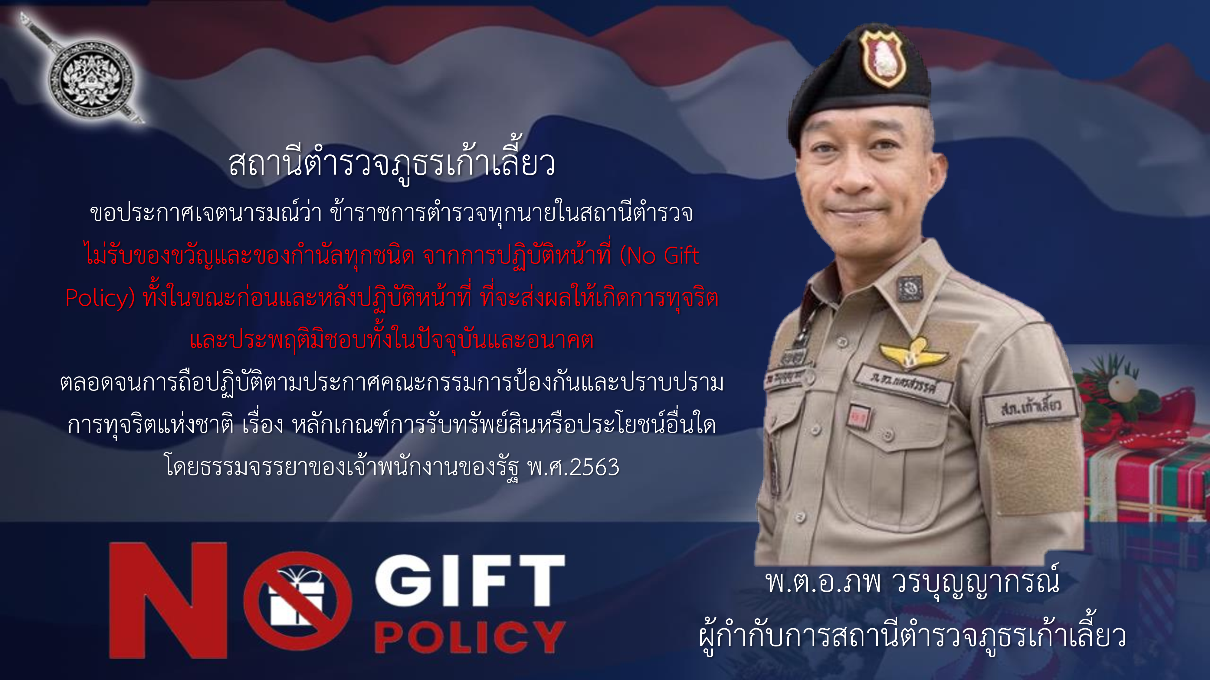 - ประกาศสำนักงานยุทธศาสตร์ตำรวจเรื่องเจตนารมณ์ที่จะไม่รับของขวัญหรือของกำนัลทุกชนิดจากการปฏิบัติหน้าที่