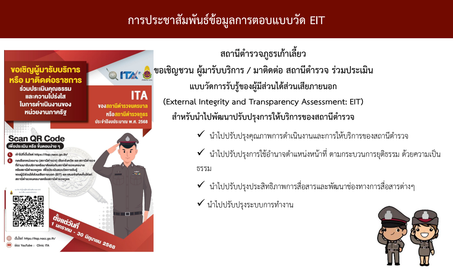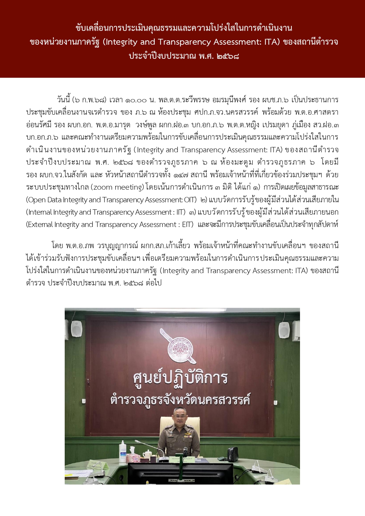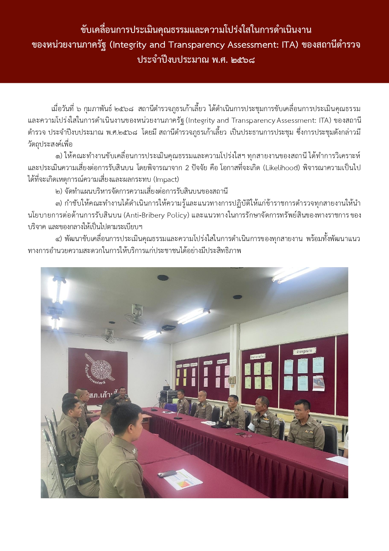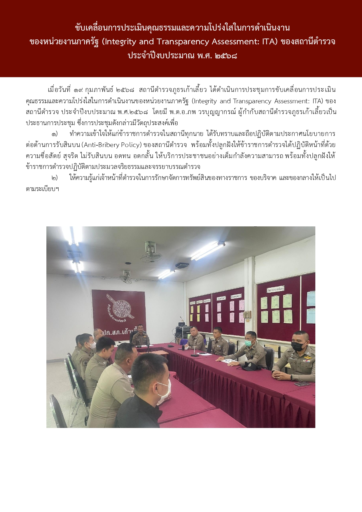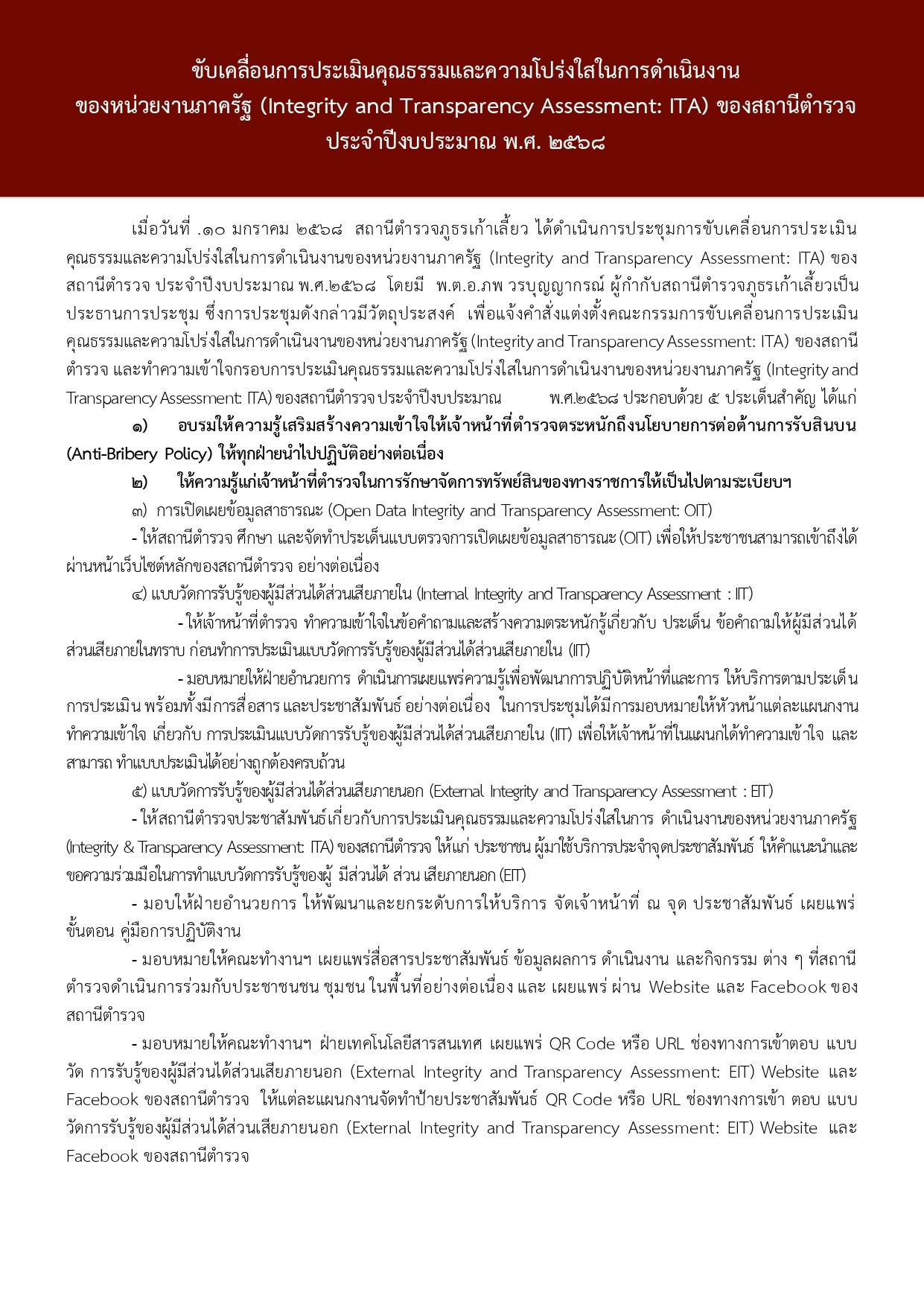 การขับเคลื่อนการประเมินคุณธรรมและความโปร่งใสในการดำเนินงาน ของหน่วยงานภาครัฐ (Integrity and Transparency Assessment: ITA) ของสถานีตำรวจ ประจำปีงบประมาณ พ.ศ. 2568