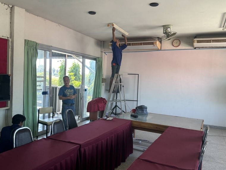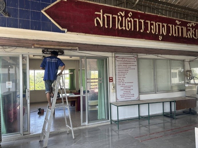 ได้นำช่างแอร์มาทำการซ่อมแซมเปลี่ยนมอเตอร์พัดลมคอยร้อนจำนวน ๑ ตัวห้องประชุมชั้น ๒ ของ สภ.เก้าเลี้ยวซึ่งเสียใช้การ